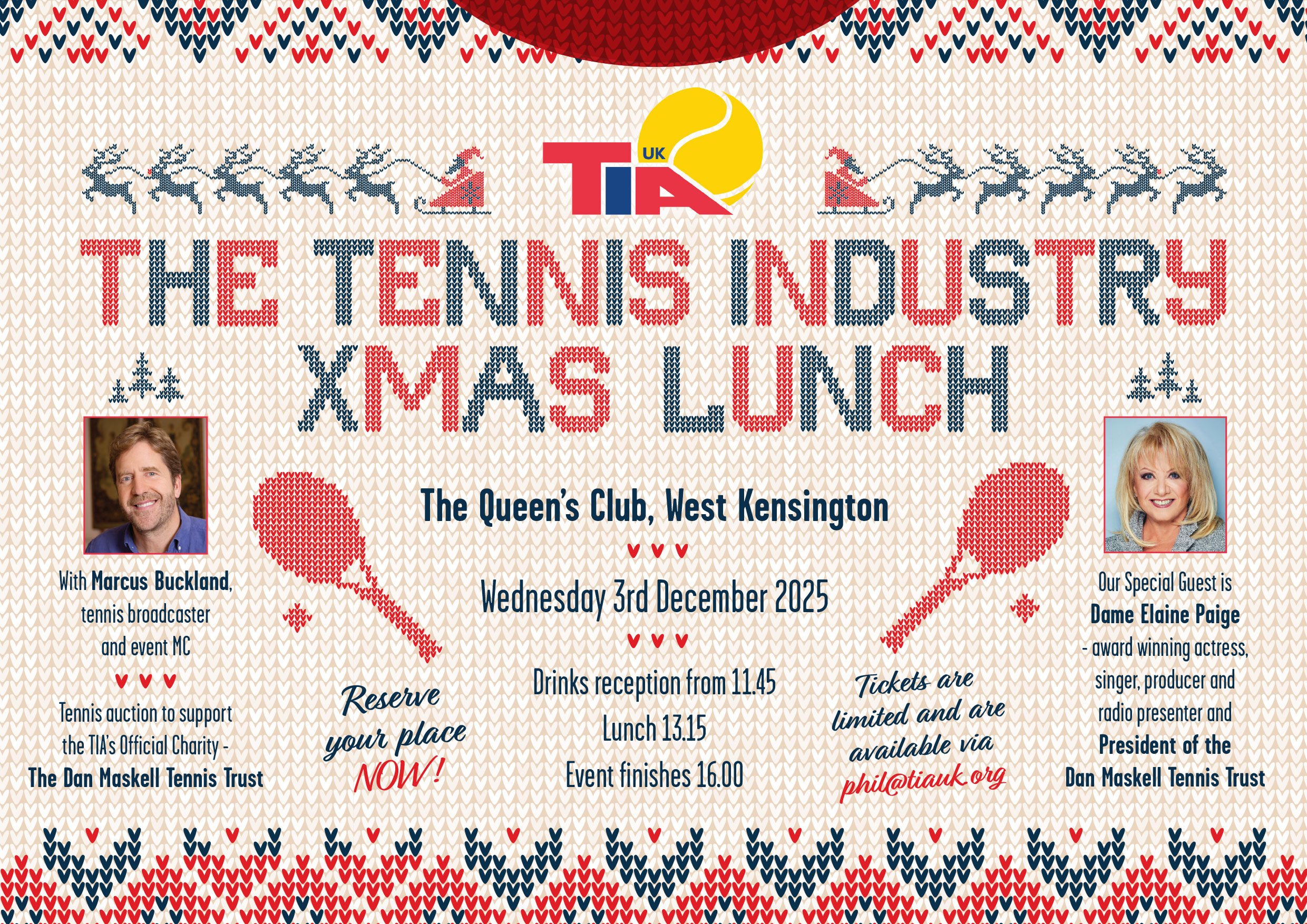 Tennis Industry Xmas Lunch – Wednesday 3rd December 2025 at The Queen’s Club, West Kensington – for ticket information contact phil@tiauk.org